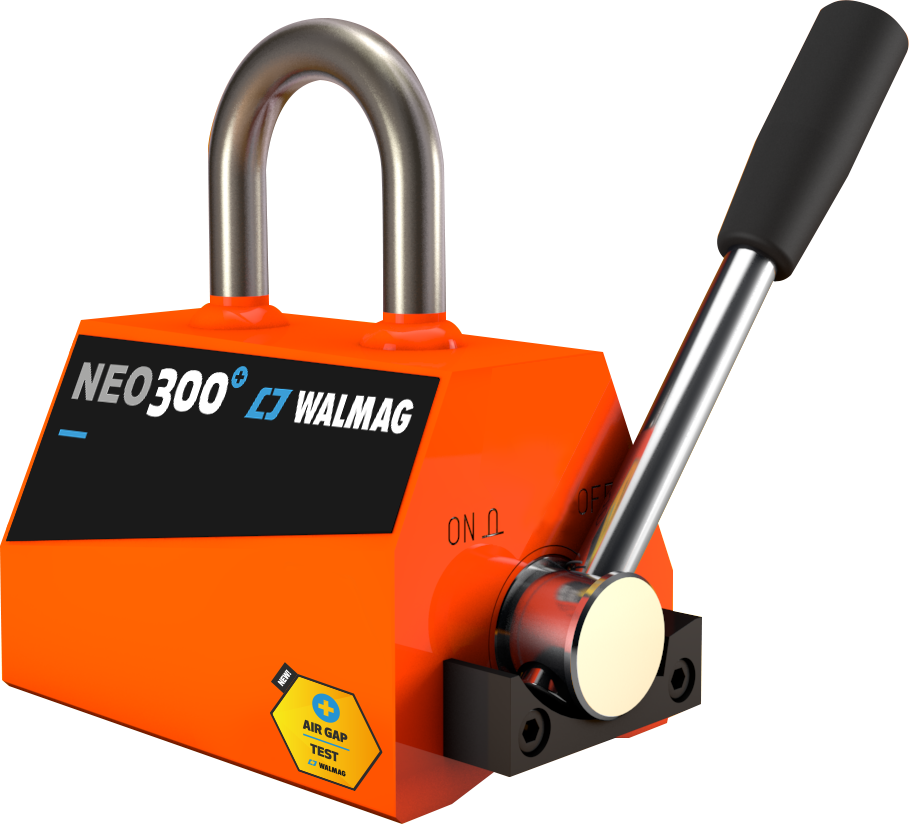 Permanentní břemenový magnet NEOL300 s nosností 300 kg/150 kg na plochý/kruhový materiál (min/max průměr kruh. materiálu 60/200 mm), maximální testovaná nosnost 900 kg. Použití do teploty max. 80°C. Hmotnost 10 kg.