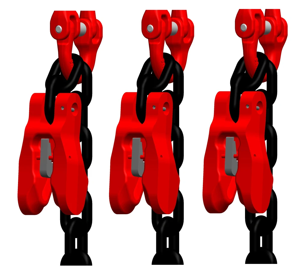 Sada 3ks zkracovačů CCL8S na řetězový 3-závěs d 8 s nosností 4 250/3 000 kg (0-45°/45-60°). Vybraný typ zkracovačů bude osazen na vámi zvolený vázací řetěz.